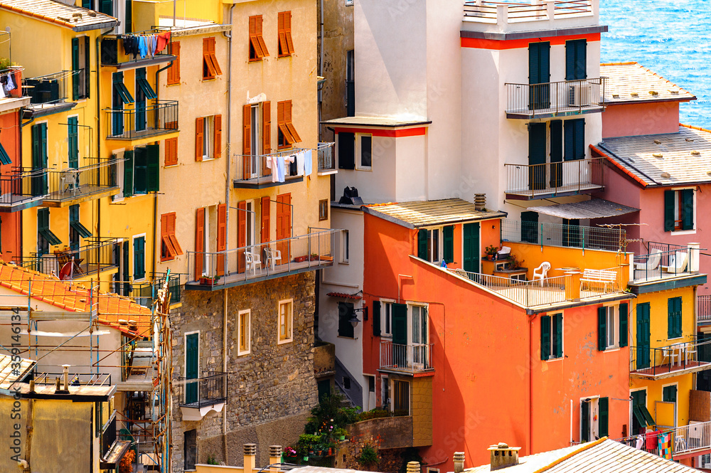 It's Aerial view of Manarola (Manaea), a small town in province of La Spezia, Liguria, Italy. It's one of the lands of Cinque Terre, UNESCO World Heritage Site