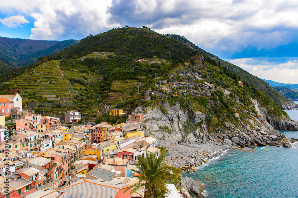 It's Aerial view of Vernazza (Vulnetia), a small town in province of La Spezia, Liguria, Italy. It's one of the lands of Cinque Terre, UNESCO World Heritage Sit