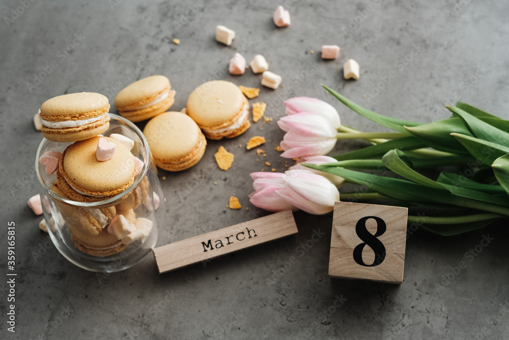 Flat Lay Background of Fresh Tulips, Yellow French Macarons and Note "March 8" on the Table