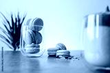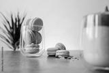 Handful of Delicious Yellow French Macarons on the Table with Glass Cup of Dalgona Coffee