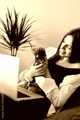 Young Adult Girl Working at Laptop from Home and Plays with Her Little Scottish Fold Cat, Concept of Remote Work, Freelance