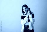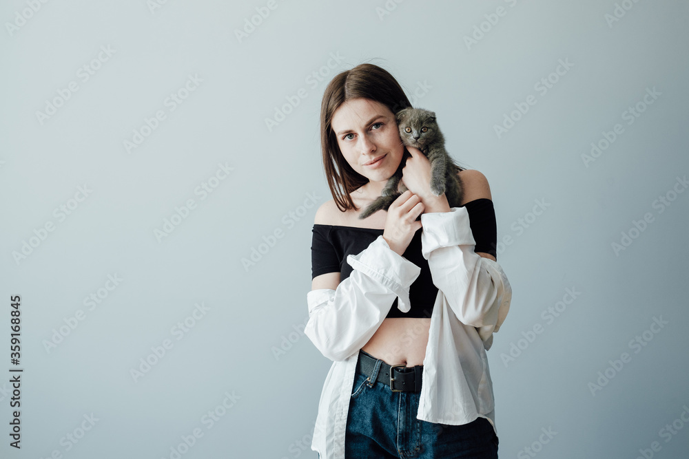 Studio Portrait of Young Adult Pretty Girl Hugs Her Little Pet Scottish Fold Cat