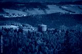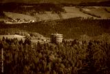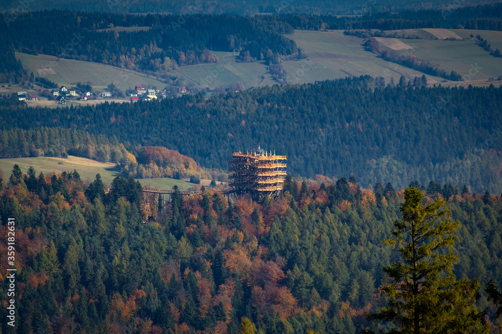 Tree top observation tower in resort town Krynica-Zdroj in autumn. View from Jaworzyna Krynicka Mountain.