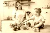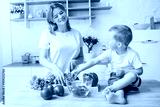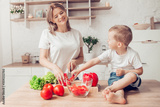 Son with mom are cutting vegetables on salad in kitchen and have a good time together. Happy family.
