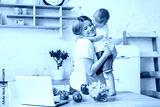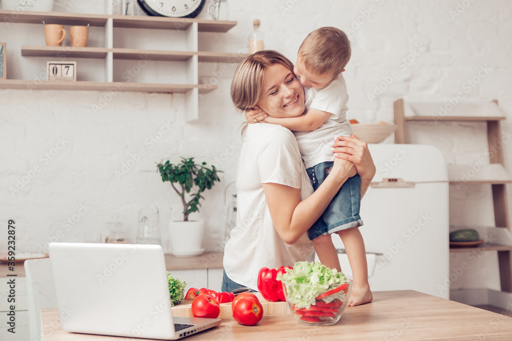 Son with mom are cutting vegetables on salad in kitchen and hugging. Happy family.