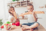 Funny boy with mom are cutting vegetables on salad and eating baguettes in kitchen. Happy family..