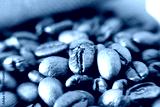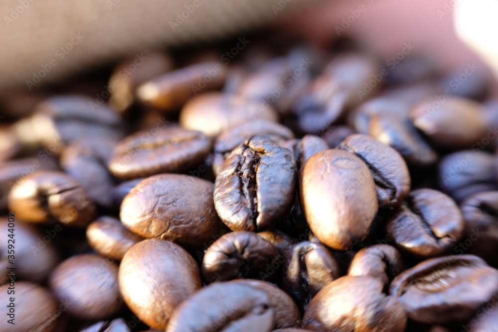 close up coffee beans and coffee cup on wood table background and space
