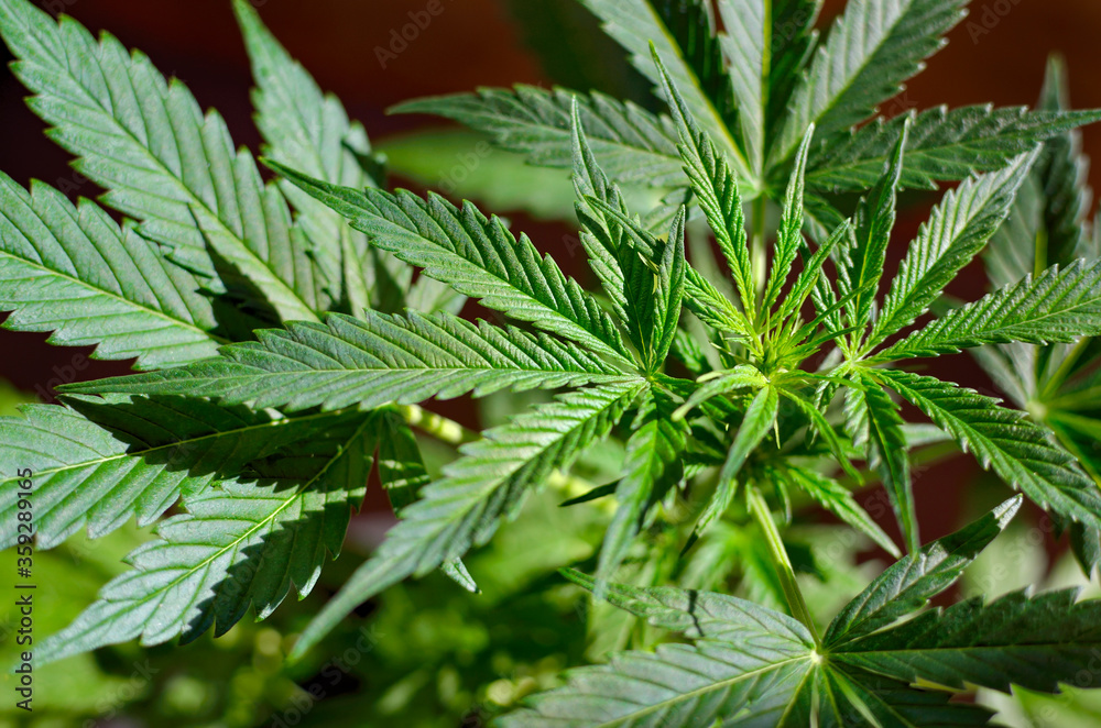 Young, green cannabis plants grow in pots. Growing medical marijuana.