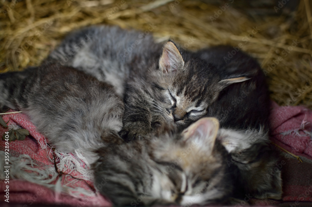 Little fluffy kittens sleep in the hay