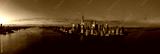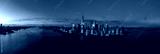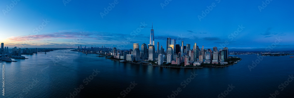 Aerial view of lower Manhattan at dusk from Hudson river.