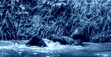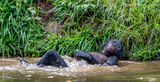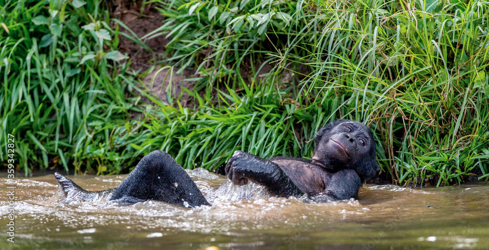 Bonobo resting, lying flat in the water. Scientific name: Pan paniscus, sometimes called the pygmy chimpanzee. Democratic Republic of Congo. Africa