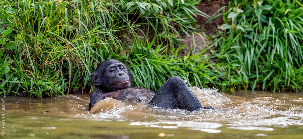 Bonobo resting, lying flat in the water. Scientific name: Pan paniscus, sometimes called the pygmy chimpanzee. Democratic Republic of Congo. Africa