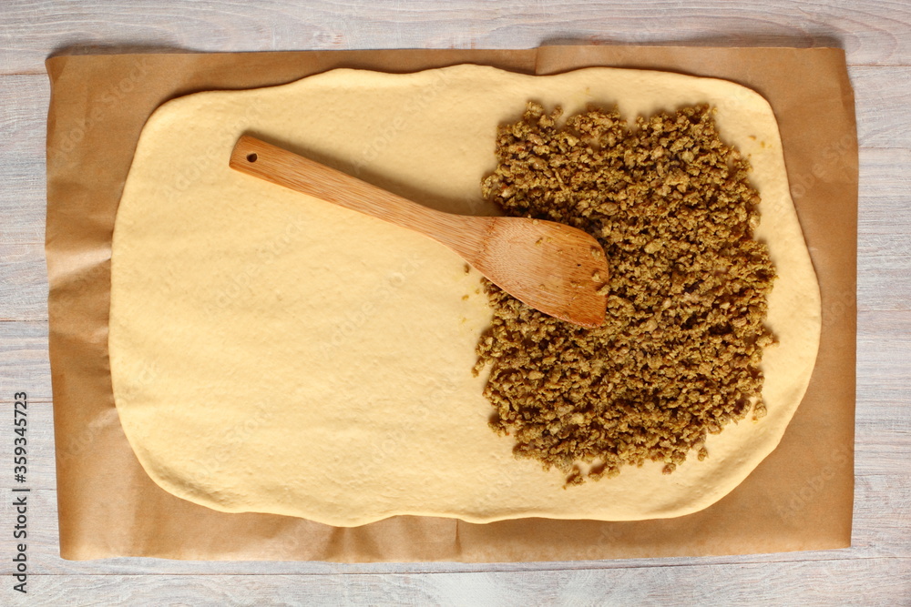 Add Meat Filling. Making Meat Pie from Yeast Dough.