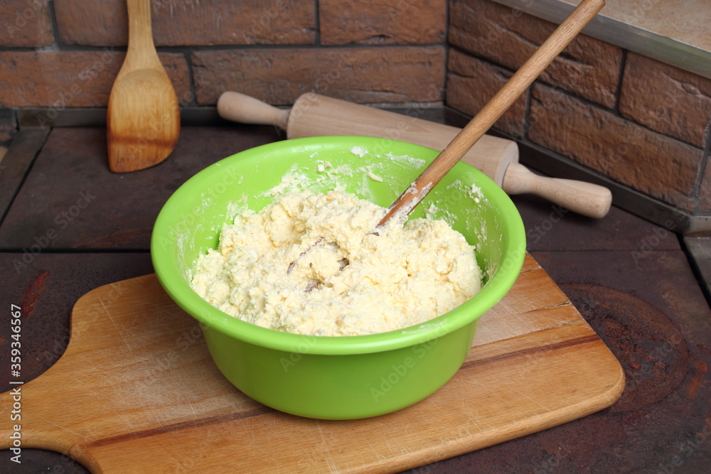 Making Cottage Cheese Pancakes. Batter in bowl.