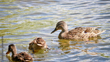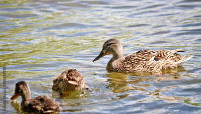 Mother Mallard (Anas platyrhynchos) swims with her ducklings in the lake. Wild ducks in their natural environment. The object of sports hunting.