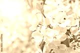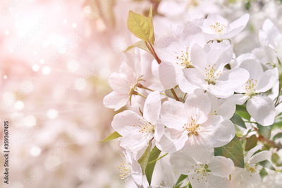 Selective focus. Spring background - white flowers of apple tree, blurred background. Template for design.