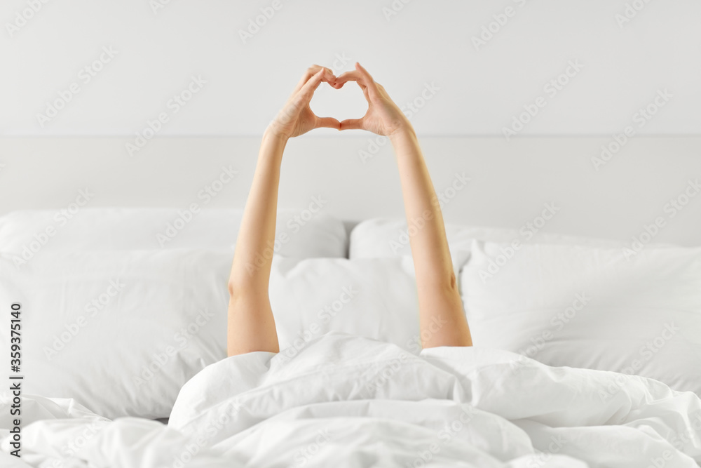 gesture, comfort and morning concept - hands of young woman lying in bed making heart shape at bedroom