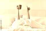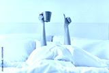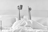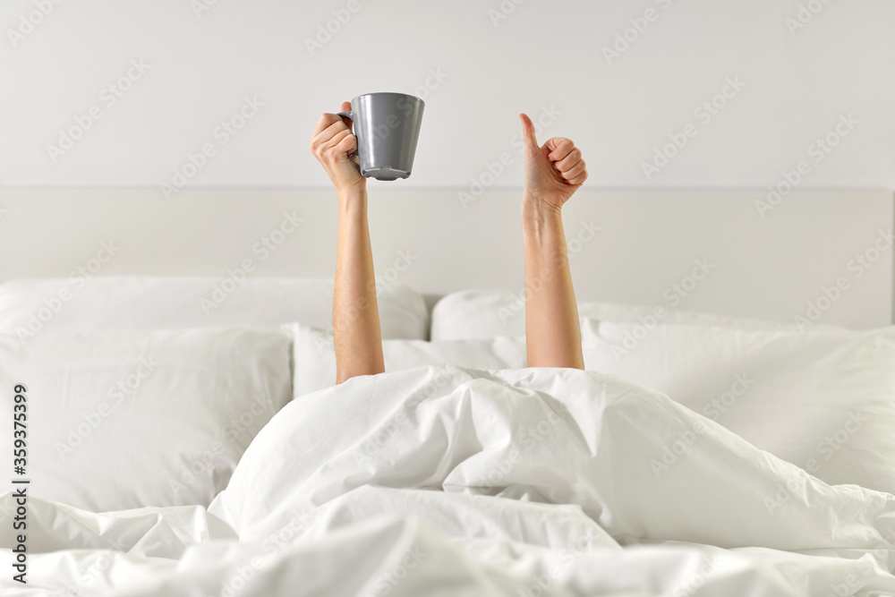morning, comfort and people concept - young woman with cup of coffee lying in bed and showing thumbs up at home bedroom