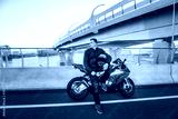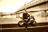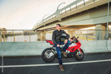 Handsome young man wearing casual outfit sitting on red sports bike on the road in sunset with helmet in hand