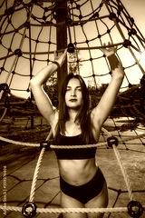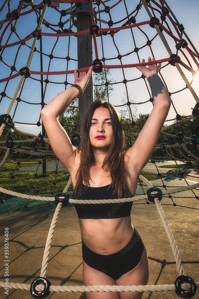 Young brunette woman, wearing black fitness topic, posing by playgorund in summer.