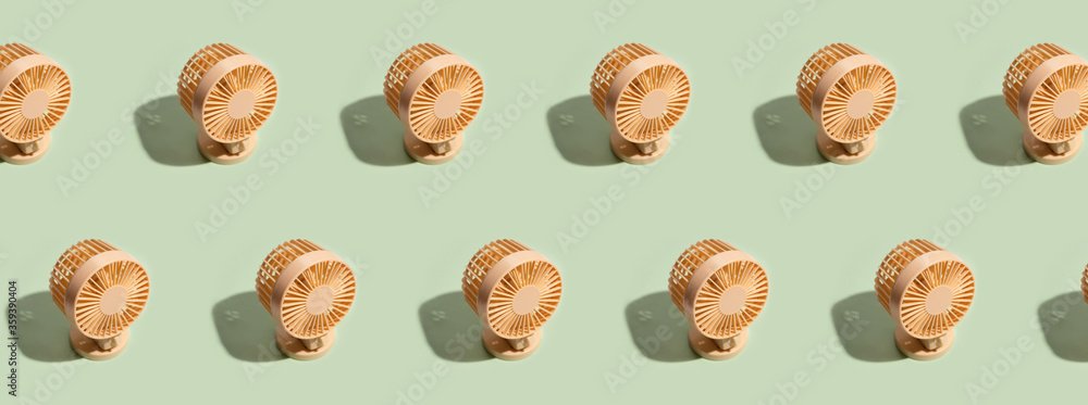 Minimal summer background of mini fan pattern on green background. Isometric trendy style with shadows