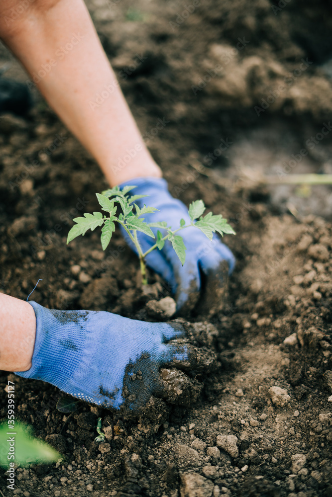 Woman gardening tomato sprouts into the soil on her backyard garden. Natural organic food
