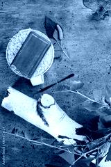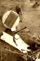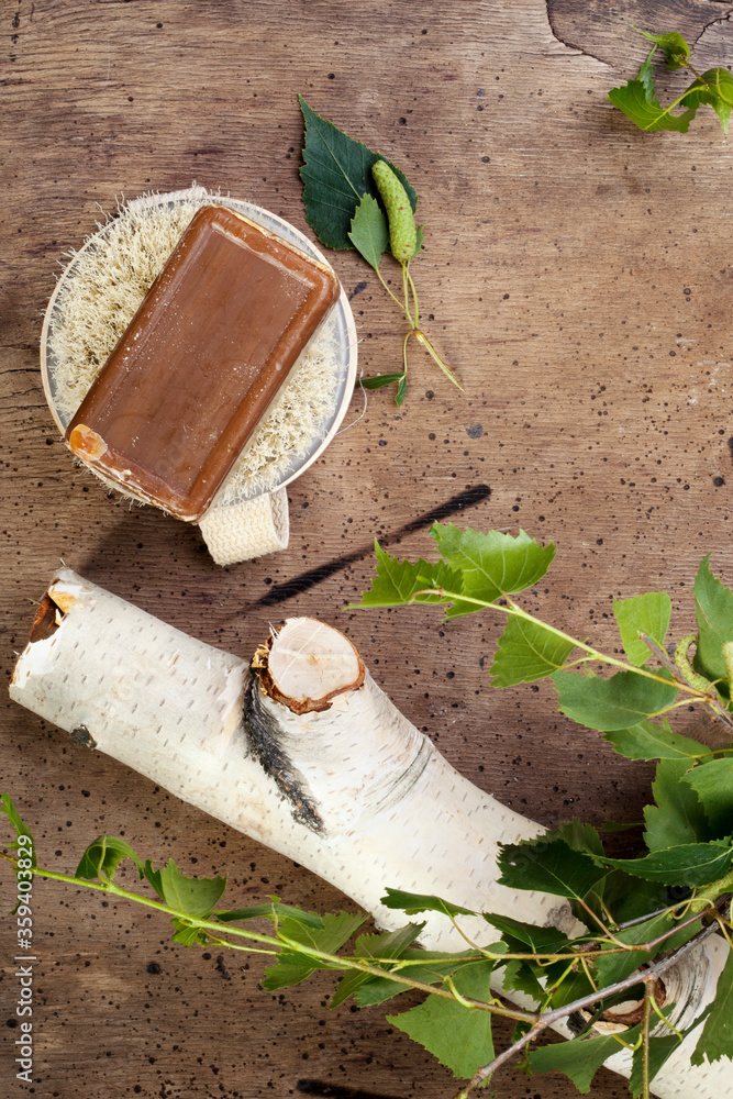 Birch twig with leaves and spring birch catkins, soap on a wooden table, background from natural environmentally friendly products