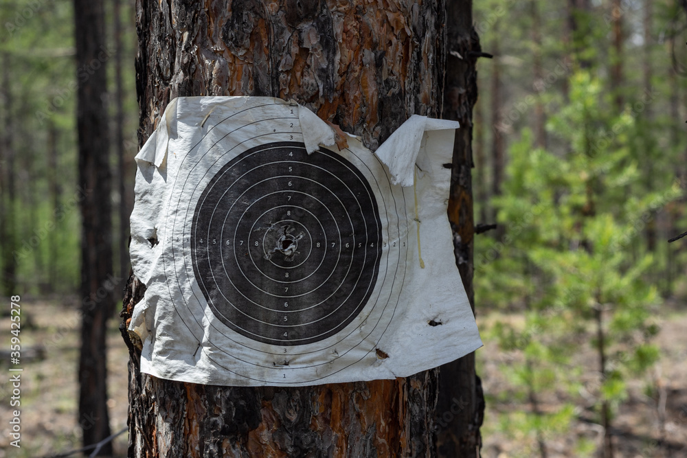 Old tactical paper target on tree located on military shooting range for active game airsoft.