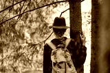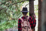 Rear view of young woman on a walk outdoors in forest in summer nature.