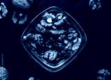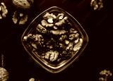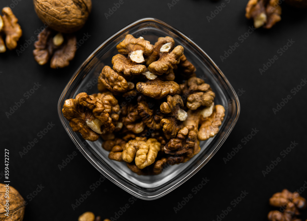Walnut in a small plate with scattered shelled nuts which standing on a black surface. Walnuts is a healthy vegetarian protein nutritious food.