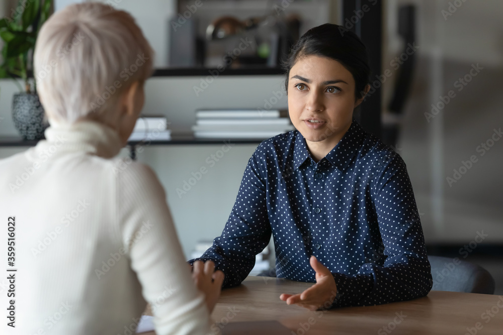 Multi ethnic indian and caucasian diverse young businesswomen sitting in front of each other in office during business meeting. HR manager and vacancy candidate talk, job interview and hiring concept