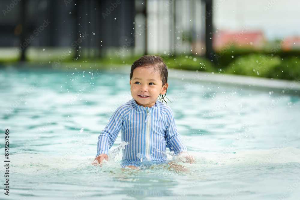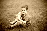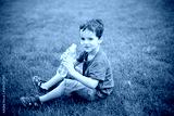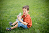 Cute cheerful child sits on a lawn with a plastic bottle of water in his hands. Bright green grass. Summer. Clothing casual. Blue jeans and a brown t-shirt. A boy of 4-6 years old is smiling.
