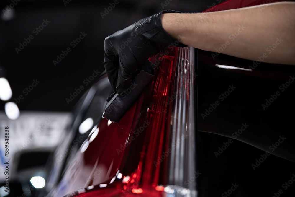 Man worker of car detailing studio applying ceramic coating on car paint with sponge applicator.