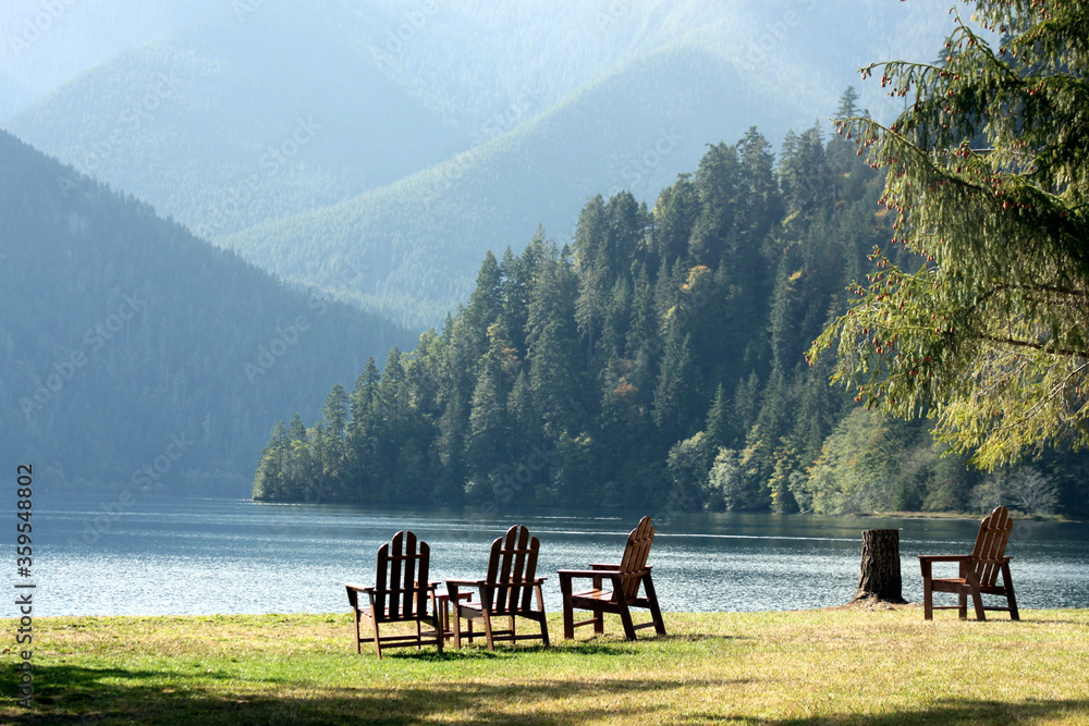 Adirondack chairs in the grass on the side of a lake overlooking pine trees and mountains