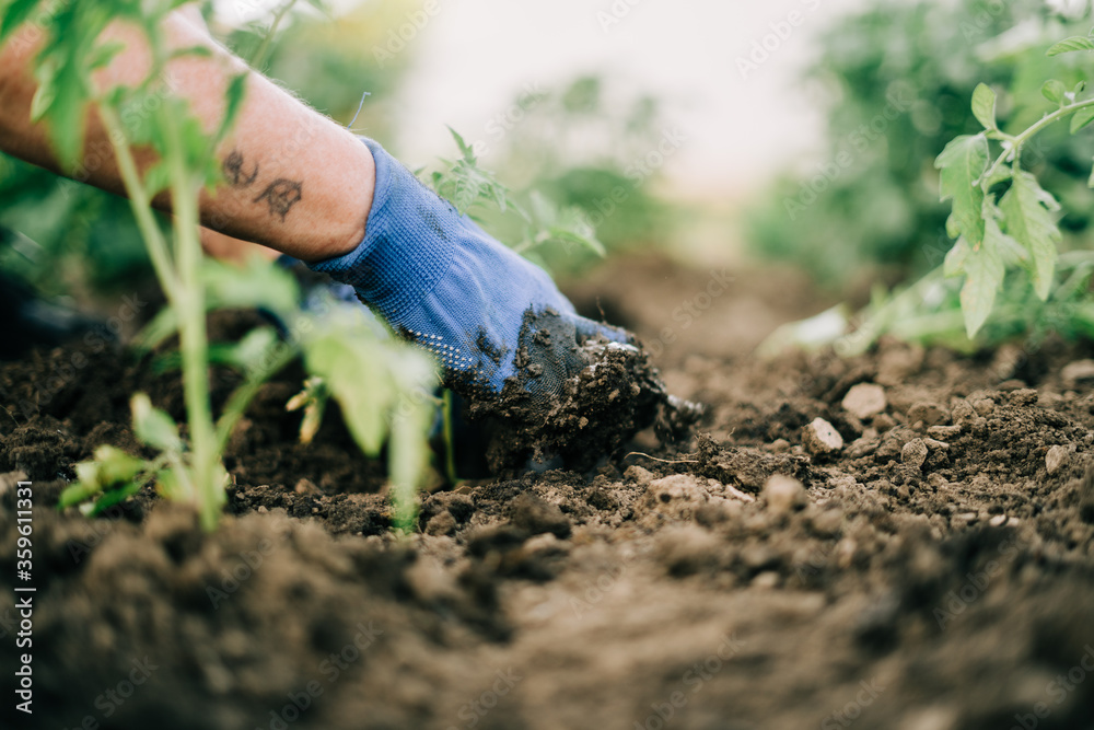 Woman gardening tomato sprouts into the soil on her backyard garden. Natural organic food