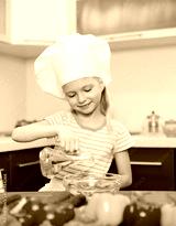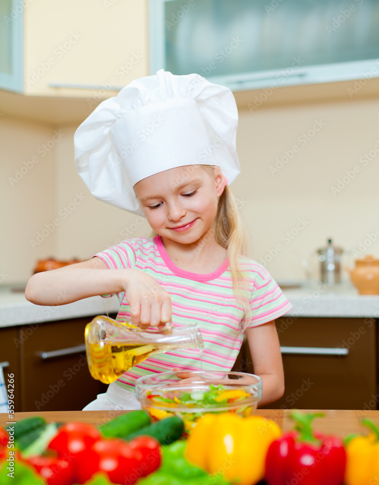 Little girl with oil preparing healthy food on kitchen