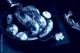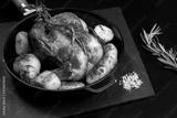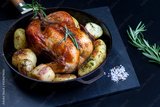 Fried chicken with new potatoes and rosemary in pan.Vid pans on top with copy space. Black background