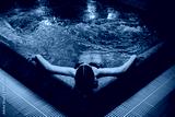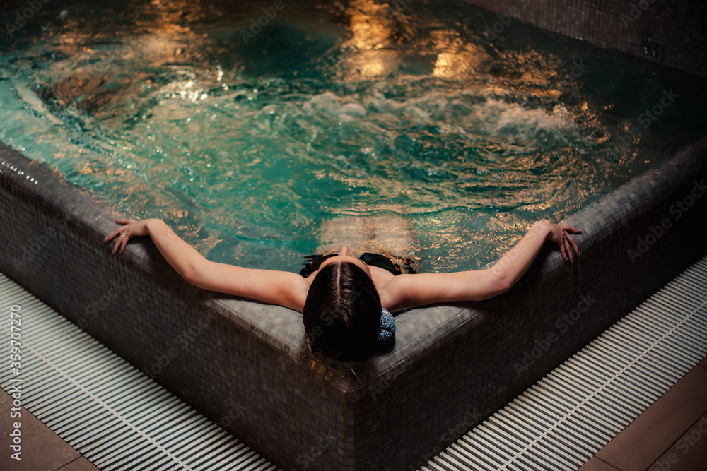 Conception of bodycare. Beauty and body care. View of a young woman enjoying whirlpool bath. Sensual young woman relaxing in spa hot tub.