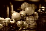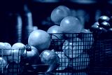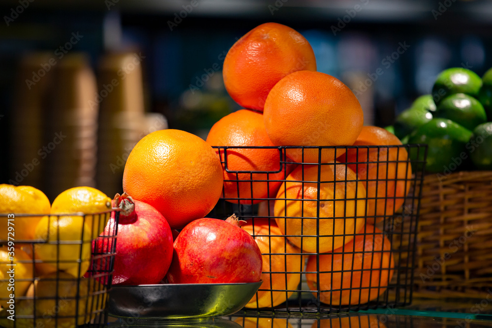 Variety of citrus fruit and garnets in black metal baskets on a glass shelf in cafe.