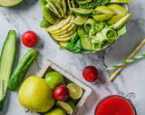 Fresh summer salad with avocado, kiwi, apple, cucumber, pear, micro greens, lime and sesame on light marble background. Healthy food, clean eating, Buddha bowl salad, top view