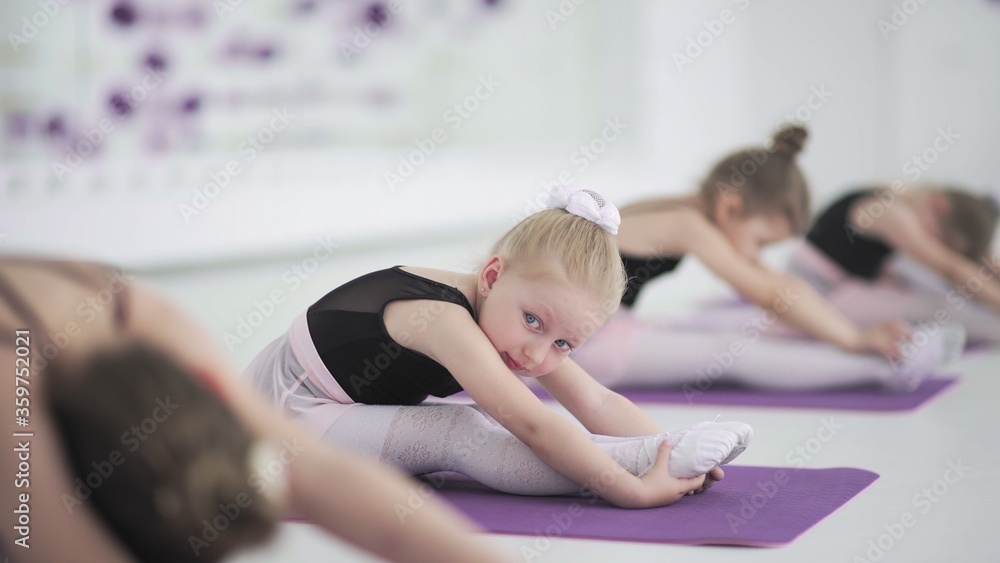 Cute little ballerinas stretching together at dancing school. Adorable little girl exercising at dance school, stretching before practicing ballet. Children, discipline concept