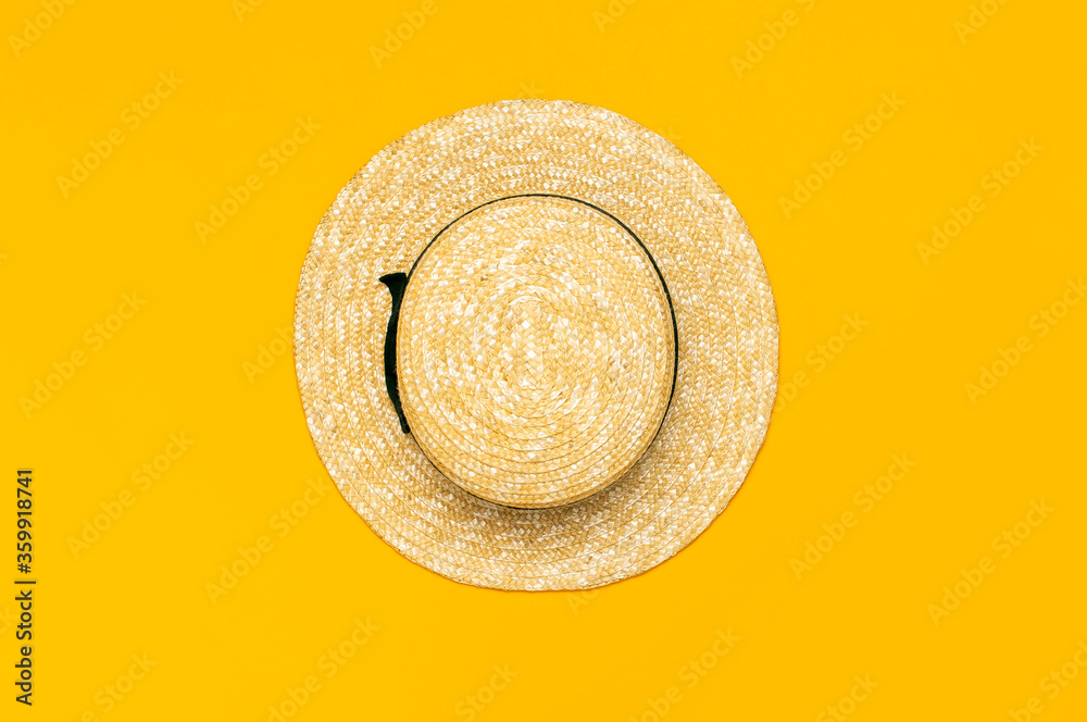 Women s summer straw hat on yellow background top view flat lay copy space. Summer travel vacation concept, single item. Female accessory, summer background. Sea sun vacation beach