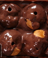 Cream puff pastry decorated chocolate icing. Directly Above.
