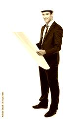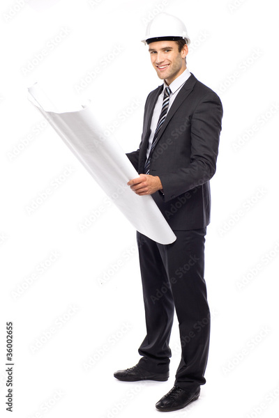 Architect in hardhat, holding blueprints