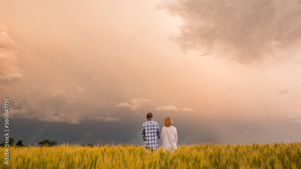 A man and a woman stand in a field of wheat against a dramatic sky before a thunderstorm