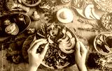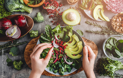 Woman cooking healthy fresh salad with avocado, greens, arugula, spinach in plate over grey background. Healthy vegan food, clean eating, dieting, top view