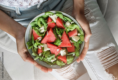 Woman in jeans eating fresh summer watermelon salad with feta cheese, arugula, spinach and greens on light background. Healthy food, clean eating, Buddha bowl salad, top view