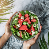 Hands holding healthy fresh summer watermelon salad with arugula, spinach and greens on light marble background with tropical leaves. Healthy food, clean eating, Buddha bowl salad, top view