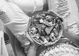 Woman in jeans eating fresh summer watermelon salad with feta cheese, arugula, spinach and greens on light background. Healthy food, clean eating, Buddha bowl salad, top view