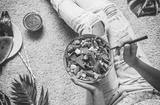 Woman in jeans eating fresh summer watermelon salad with feta cheese with smoothie on light background with tropical leaves. Healthy food, clean eating, Buddha bowl salad, top view, toning